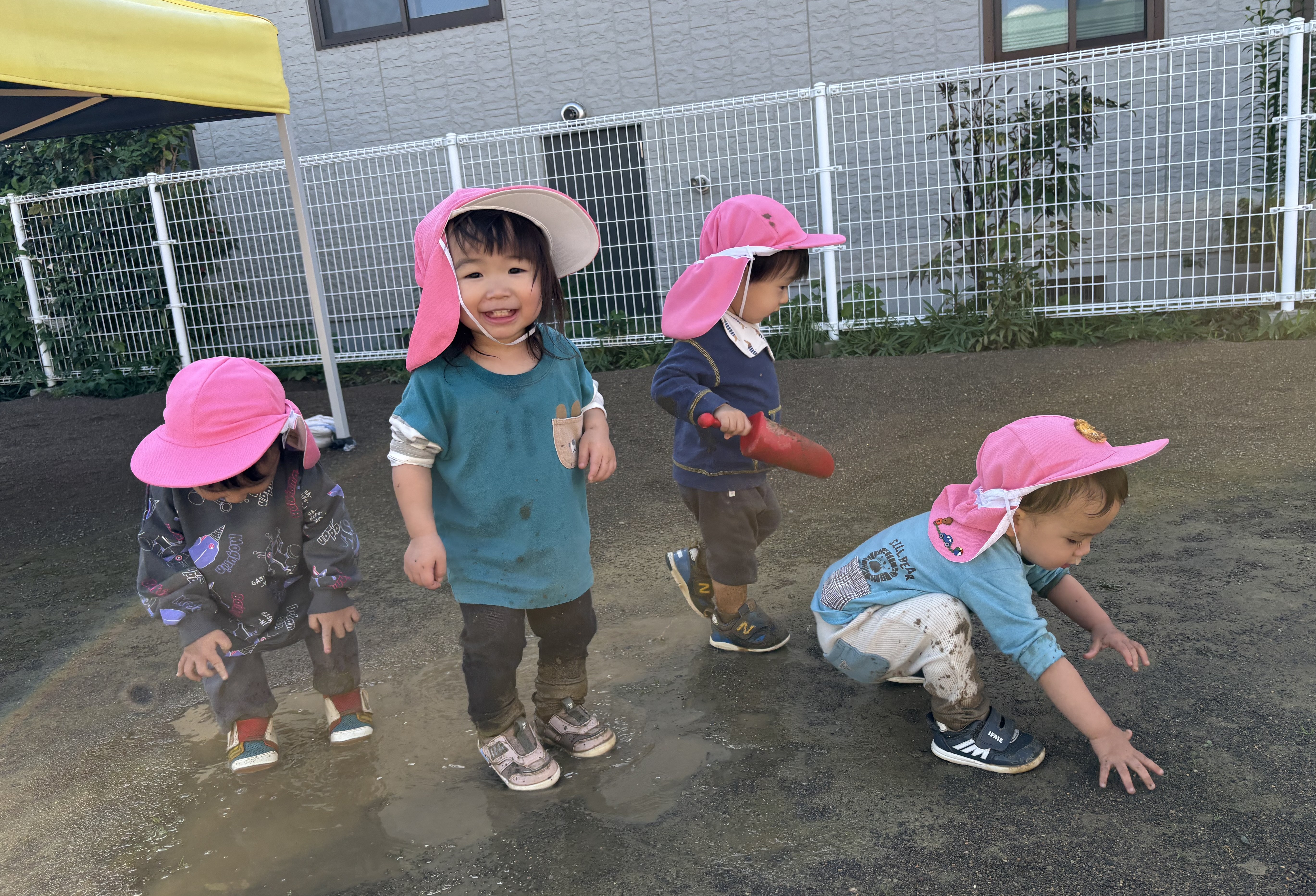 雨あがり・・・水たまりを見つけてはお友だちと一緒に、バシャバシャと音を楽しみじわじわと濡れる感覚に浸りそのすべ...