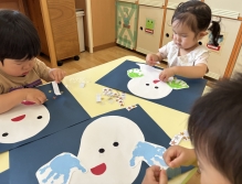 指先を使い、自分でシールがはがせるようになりました。「め!」「くち!」と自分の目や口を指差しながらシールを貼り...