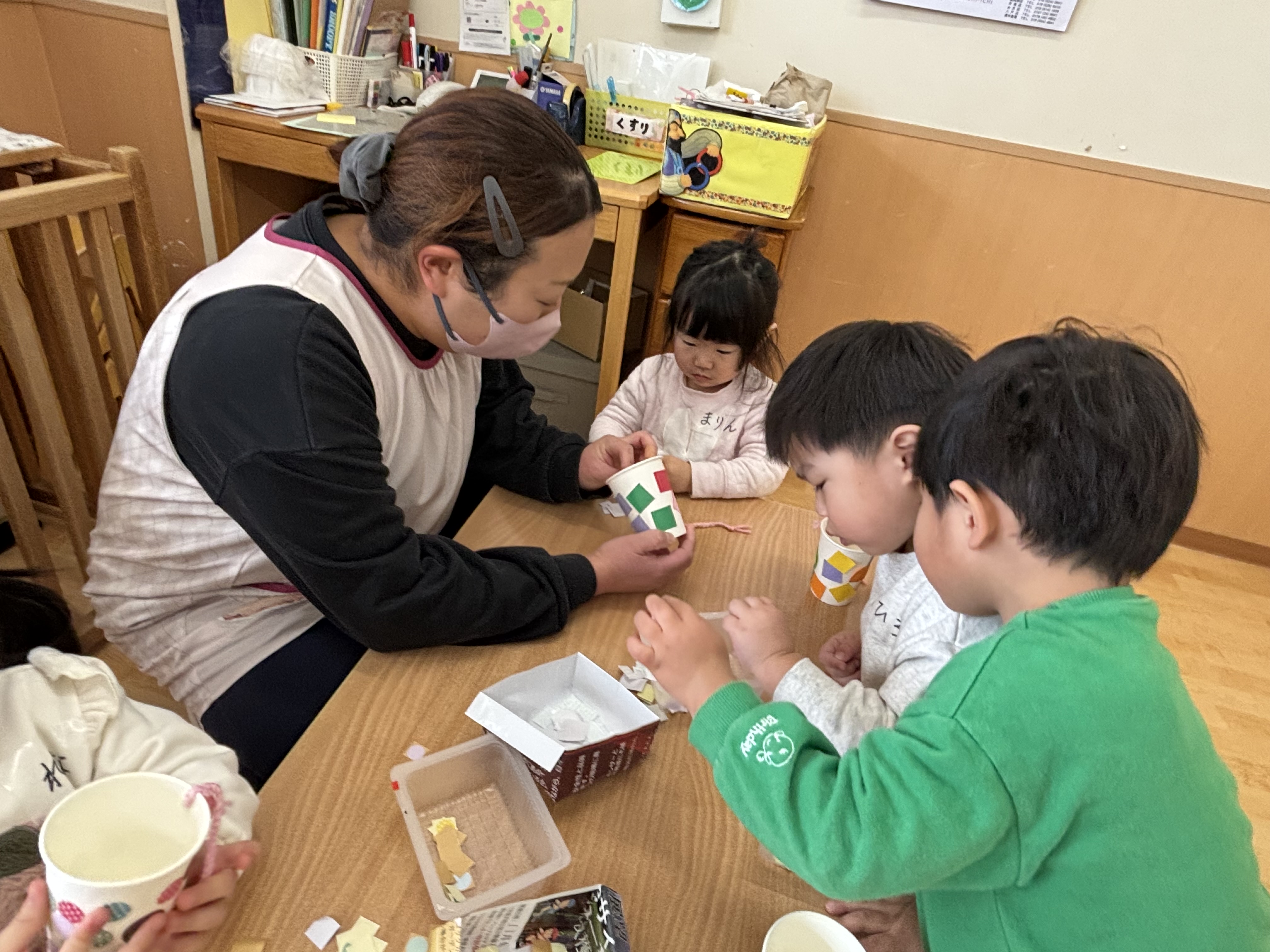 法人の他園の先生が一日だけ担任になり、制作やかみなりゲームで、楽しい時間を過ごしました。