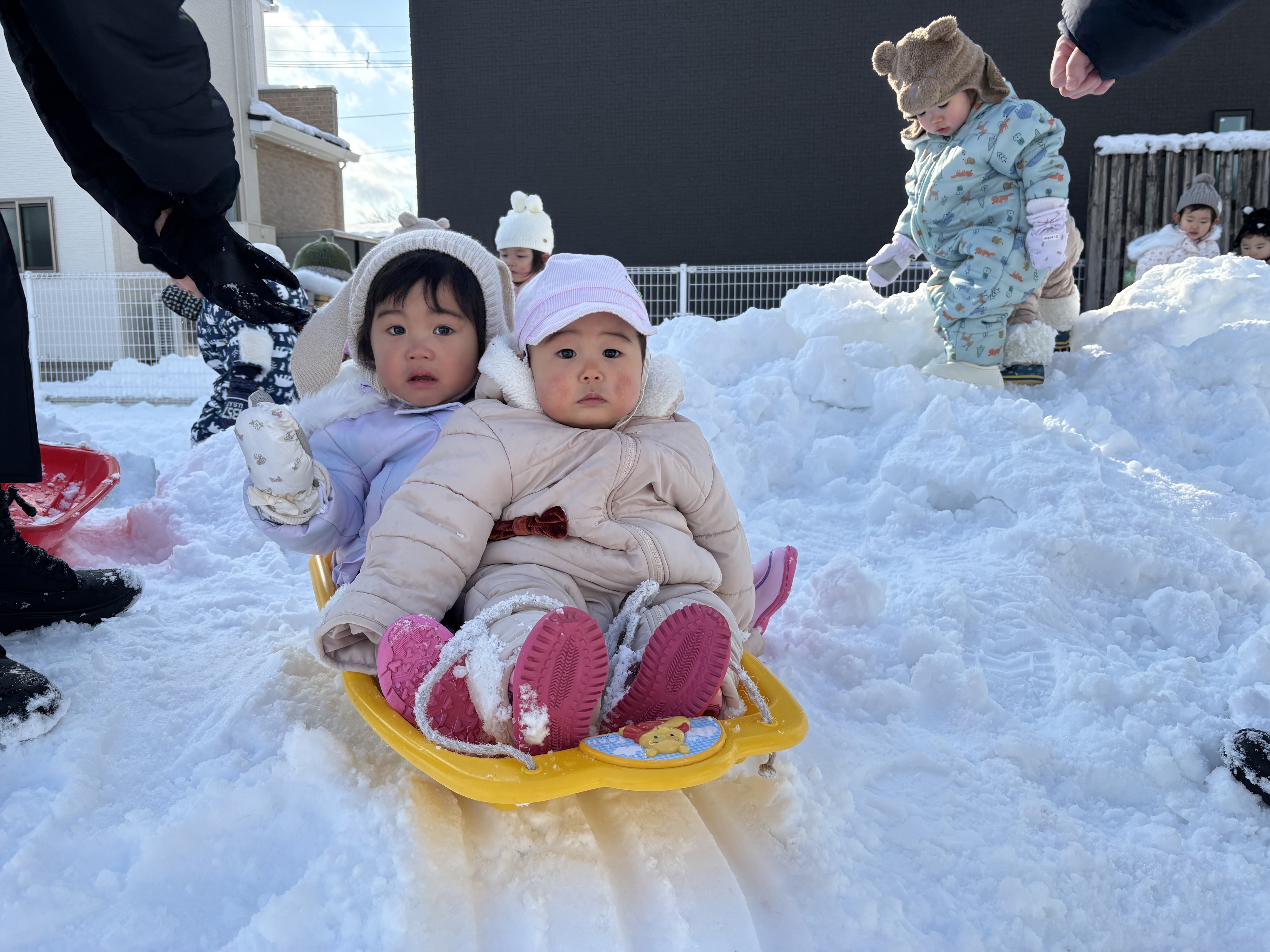 0歳児にとっては、園での初めての雪あそび!ソリに慣れてくると、少しずつ笑顔も見られました。