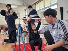 2歳児は、はじめて鉄棒に挑戦! 腕の力を使い、上手にぶら下がることができました。